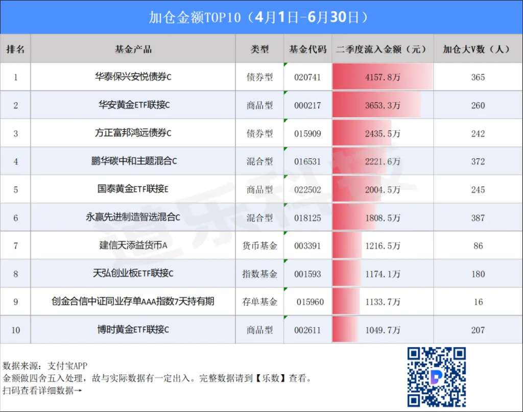 依托乐数的大V日观察功能,设定特定的时间区间,按大V的加仓金额降序排列,筛选出排名前十的基金,制作成如图的「大V加仓榜」。