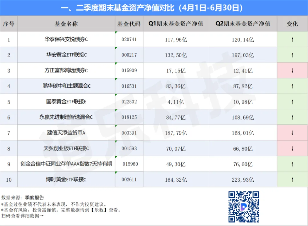 在前十只基金的一、二季度报告中,我们重点对比了基金期末基金资产净值。结果发现:前十只基金里有7只基金规模实现了增长,有3只基金规模下降。
