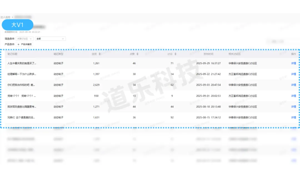 在确认“大V1”的粉丝规模、互动率与阅读量等核心数据后,还可以进一步点开其详情页,追踪该达人近期的动态与笔记表现。通过这些内容,可以更直观地观察其对热门基金话题的解读方式,以及在评论区引发的讨论热度,从而判断其带动投资者关注与转化的真实影响力。