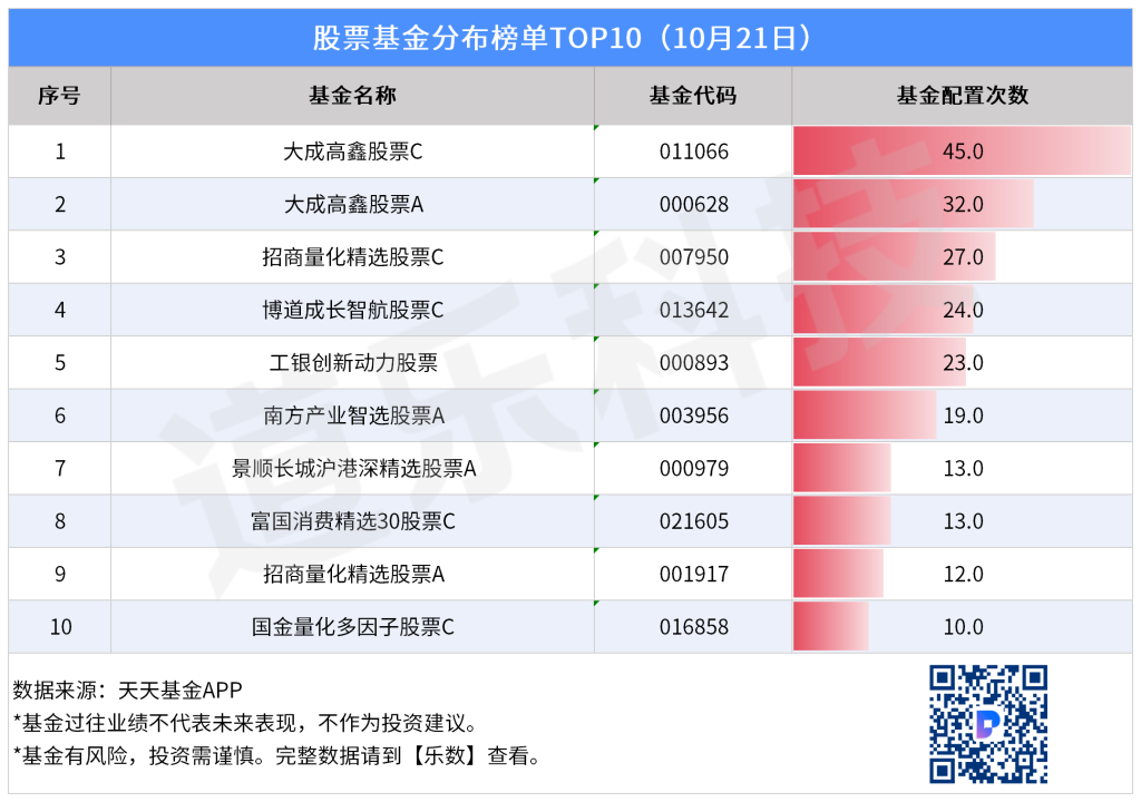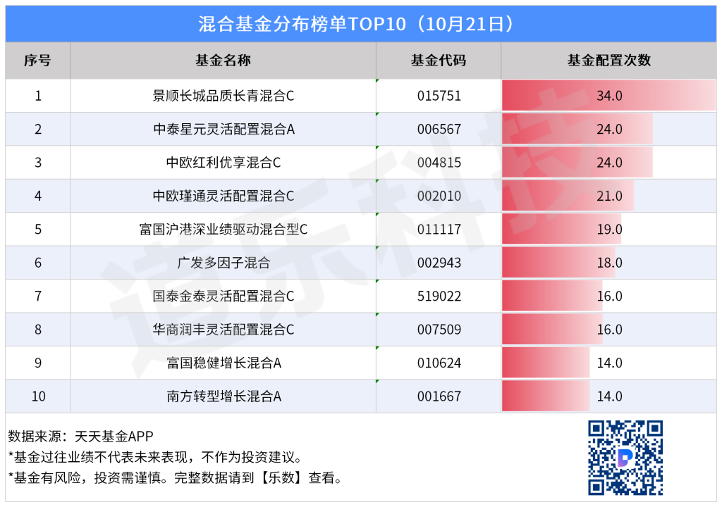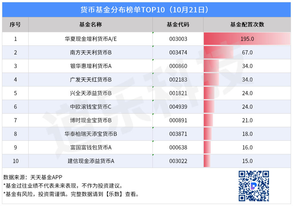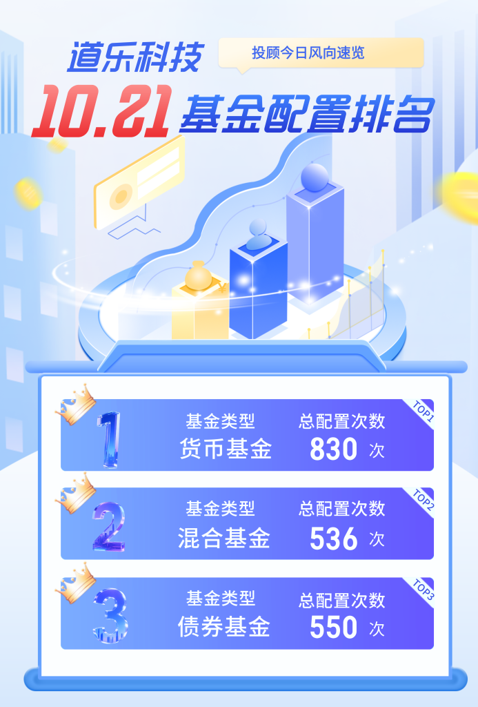 从10月21日最新榜单来看,货币基金配置热度飙升,股票与混合基金同步升温,资金流向更显谨慎与策略性。