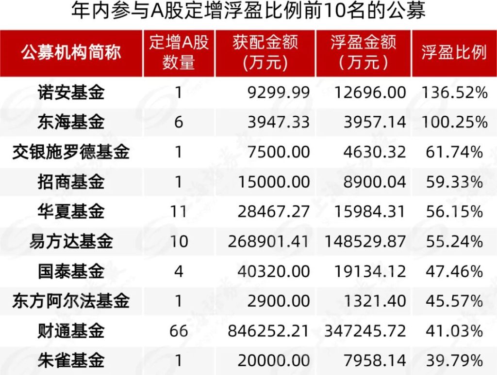 公募排排网数据显示,按定增上市日统计,截至10月22日,今年以来共有37家公募机构参与了74家A股上市公司的定增,合计获配金额达到302.92亿元,较去年同期的235.73亿元相比,增幅为28.5%。同时,公募定增的浮盈金额逾百亿元,平均浮盈比例超35%。