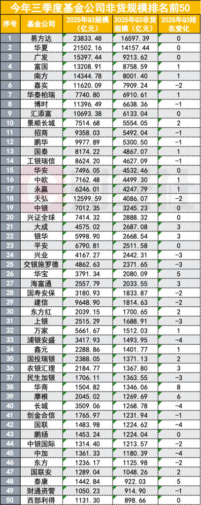 先看非货管理规模第一梯队:易方达、华夏、广发、富国、南方、嘉实、华泰柏瑞、博时、汇添富、景顺长城位列前十。