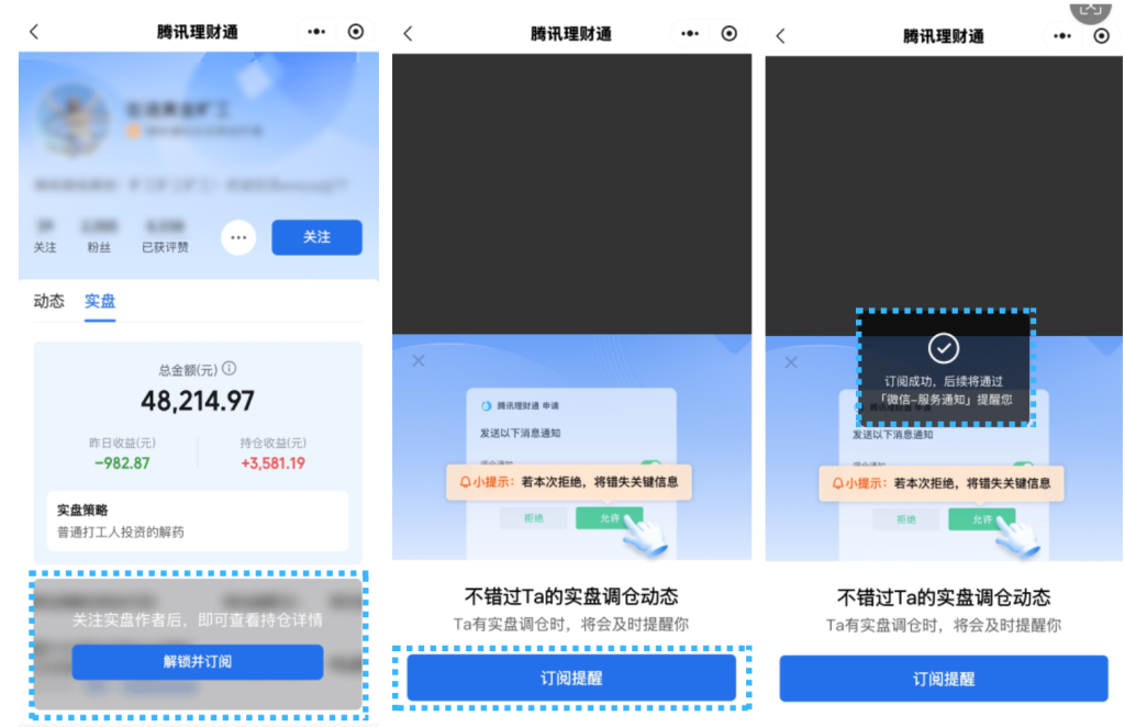 现在,理财通的订阅推送机制能在主要交易时段自动提醒粉丝,只要用户订阅你,就能第一时间看到调仓动态。