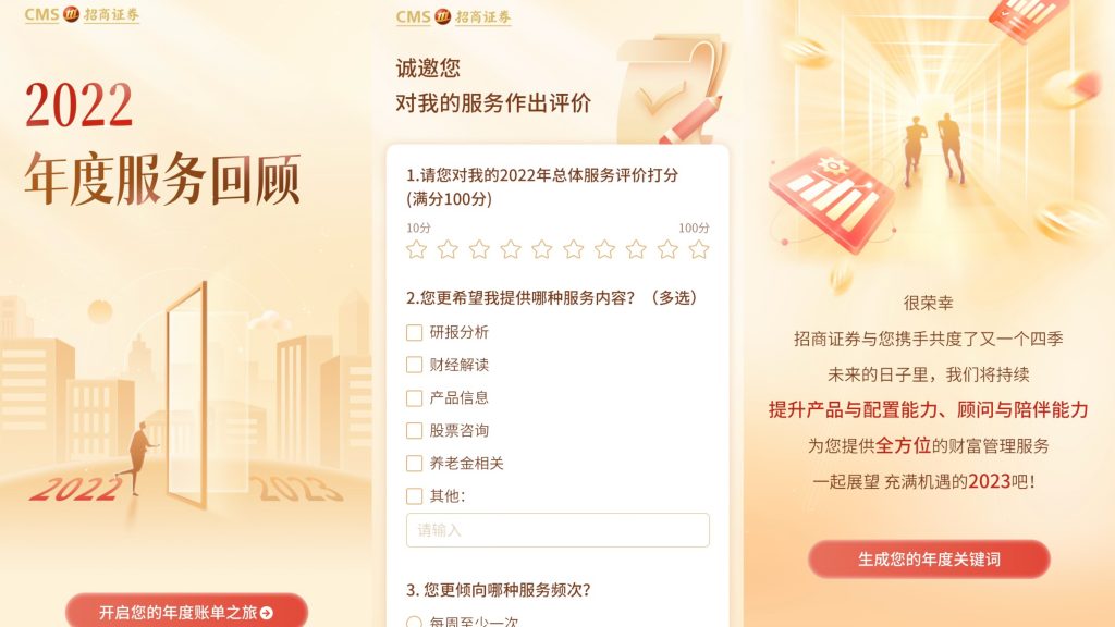 道乐科技为招商证券设计了以服务回顾 、客户评价 、分享海报为核心机制的年度海报,让用户在复盘中感知品牌温度,强化互动与信任。