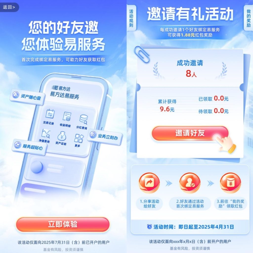 例如我们为易方达基金定制开发的“易服务”邀请有礼活动:通过邀请好友绑定易服务获得微信红包的形式,达到引导用户体验易服务,提高平台的用户量的一个效果。