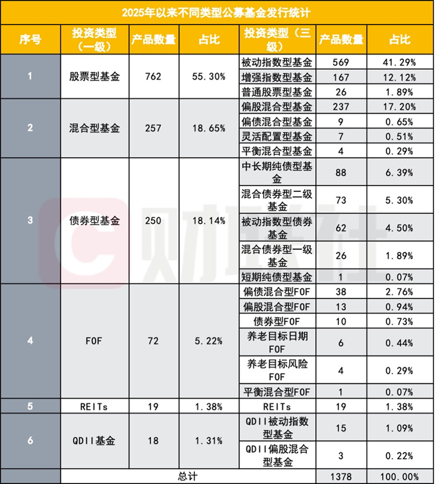 今年新基金发行数量达到1378只,创近三年新高,权益类基金发行占比达72.5%,其中大部分为指数型基金。被动指数基金成为发行主力,推动整体市场呈现“权益强、债基弱”的结构。行业竞争明显加剧,头部机构发行量大幅领先,中小机构则借创新型产品寻求突破。