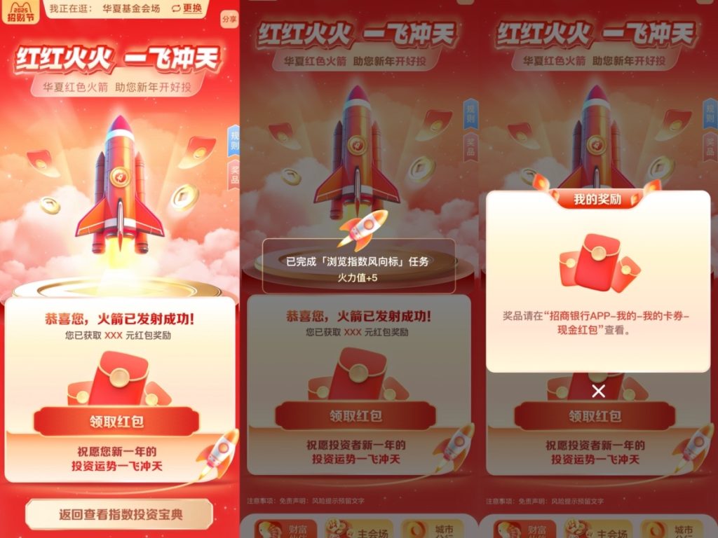 道乐为华夏基金打造的定制化招财营销活动,以“红色火箭,一飞冲天”为核心主题,将火箭发射的动感意象与新年投资运势完美结合。