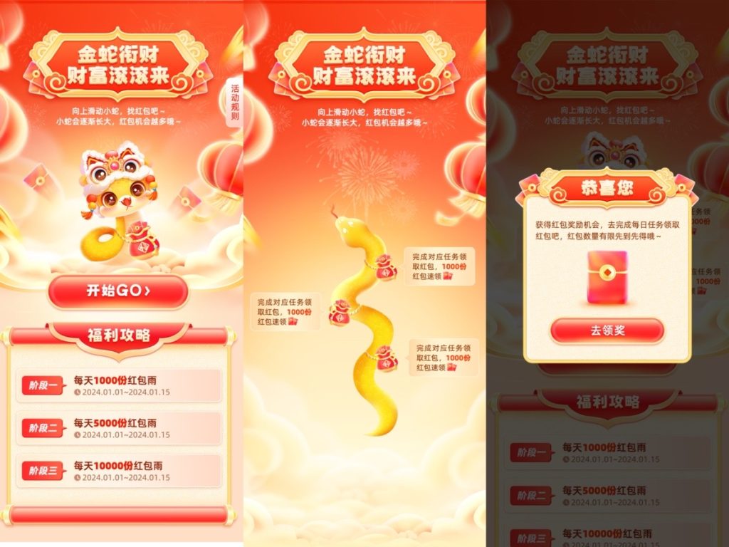 活动期间,用户每日进入页面向上滑动金蛇,金蛇在互动中逐步长大,并伴有红包随机掉落。完成滑动后,用户点击红包即可跳转至产品页面完成浏览、加选、关注等任务,成功完成任务即可解锁对应红包奖励。