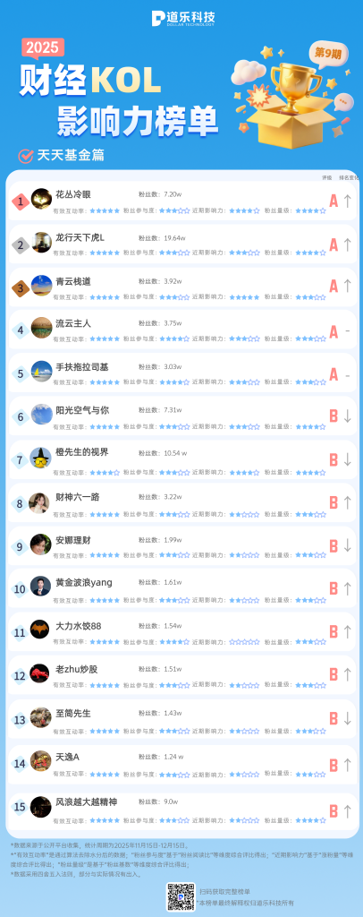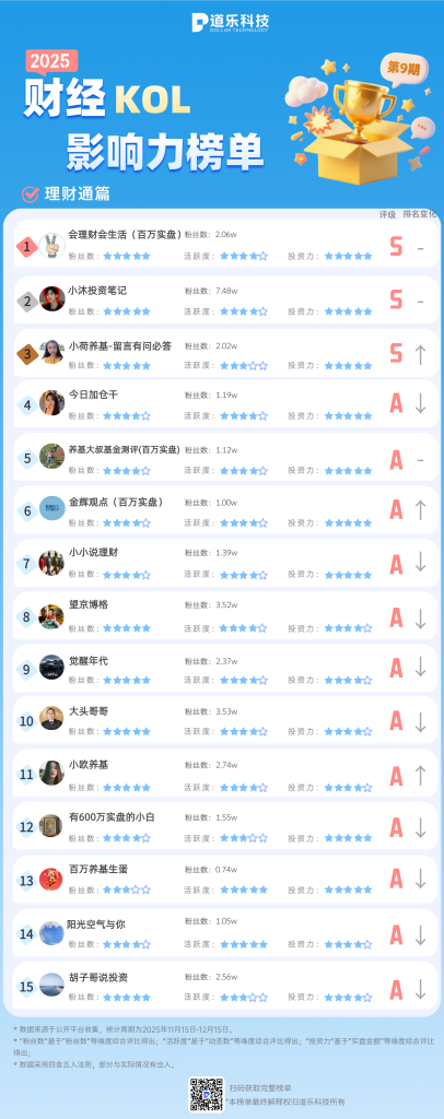 - 腾讯理财通榜单整体表现较为平稳,榜单头部位置稳定。“会理财全生活(百万实盘)”与“小沐投资笔记”继续位居前列,展现出持续的影响力。“养基大叔基金测评(百万实盘)”表现突出,凭借高质量的实盘内容与持续互动,排名上升8位至第5名。