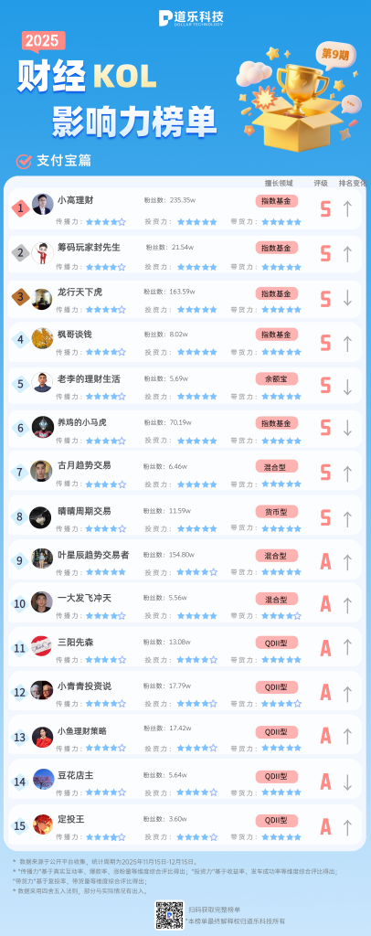 - 支付宝榜单整体表现强劲,约六成博主排名上升。“筹码玩家封先生”凭借其突出的投资策略内容与高频的粉丝互动,排名跃升44位,强势攀升至第2名。同时,“枫哥谈钱”和“定投王”作为新进博主,分别凭借专业深度的理财内容与高互动带货效率,首次登榜即位列第4名和第15名,展现出强劲潜力。