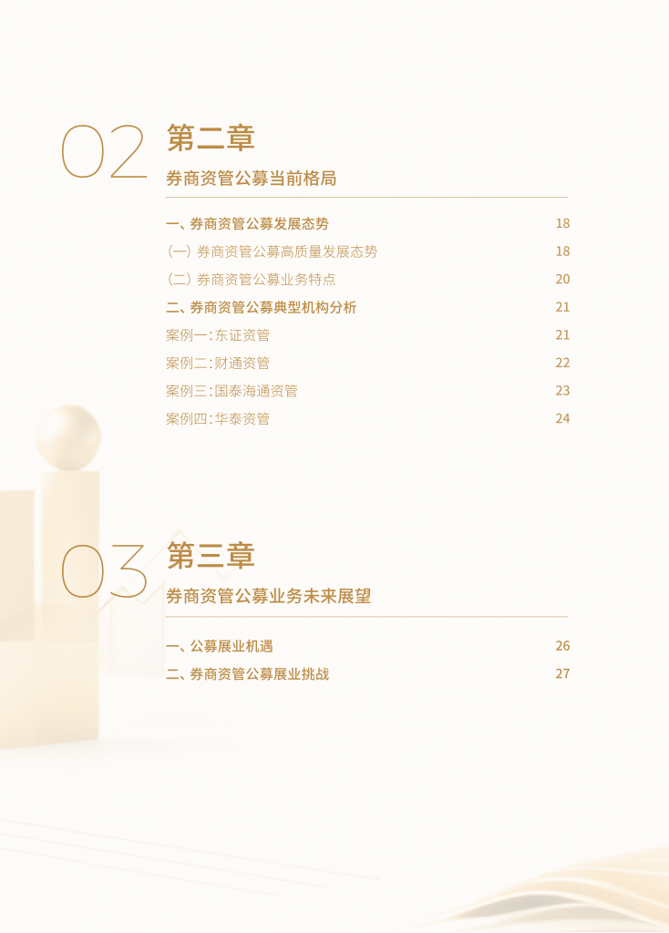 该白皮书回顾了2025年券商资管公募业务发展现状:行业总规模约9.35万亿元,公募业务头部效应显著,东证、华泰、中银、财通四家规模占超65%;年度无新增公募牌照,券商资管合并及参公大集合改造持续推进;产品以债券和混合型为主,业绩显示主动权益和债券类基金中长期表现较优;未来机遇在于财富管理协同与牌照稀缺性,挑战则包括人才竞争、产品同质化及品牌认知不足。